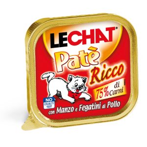LECHAT ADULT PATÉ RICCO WITH BEEF AND CHICKEN LIVERS has been formulated with a high meat content. A creamy steam cooked paté enriched with Vitamins A-D3-E, developed for the well-being of our little friends. LeChat is a complete food line for your cat’s daily diet, formulated with quality meat. A wide choice of tasty flavours, with no added colours or preservatives. Made in Italy and No Cruelty Test.