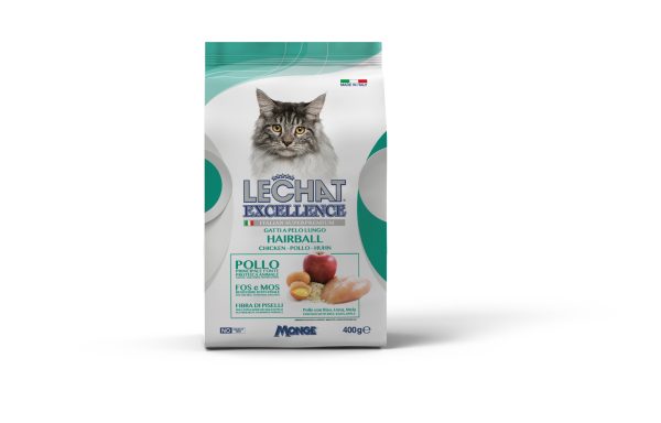 LE CHAT EXCELLENCE HAIRBALL CHICKEN is a complete pet food for adult cat with rice, eggs and apple to help minimize hairballs. Le Chat Excellence is the product line created to offer only the best for your cats. A complete pet food formulated with ingredients which guarantee every day the wellbeing of our four legged friends. Recipes with high quality of feed materials like eggs, source of highly digestible proteins with elevated biological values. The apple pulp and pea fiber, sources of soluble and insoluble fibers, help to minimize physiologically hairballs. No added dyes and artificial preservatives.