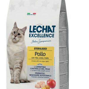 LECHAT EXCELLENCE CAT STERILISED CHICKEN is a complete pet food for adult sterilised cats with rice, eggs and apple. A complete pet food formulated with ingredients that ensure the well-being of our four-legged friends every day. Top quality ingredients such as chicken and rice are appetising and easy to digest; apples are a source of fibre and, together with L-carnitine, help maintain an ideal weight. Made with prebiotics (FOS and MOS) for intestinal wellness. No added dyes and artificial preservatives.