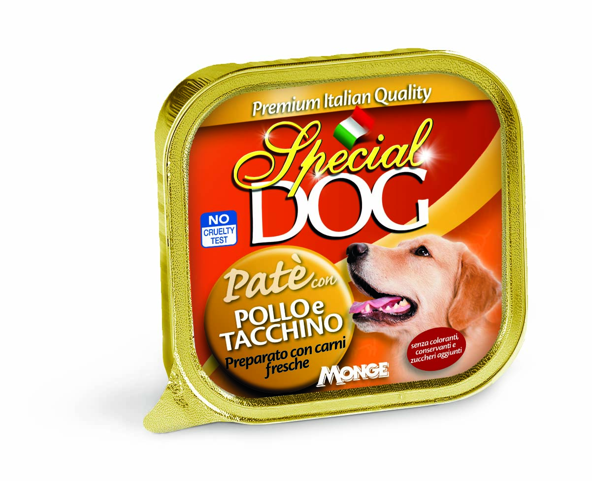 SPECIAL DOG ADULT PATÉ WITH CHICKEN AND TURKEY is a complete balanced pet food for adult dogs of every sizes. The recipe is fortified with vitamins A-D3-E to support bodily functions. The paté are steamed to maintain the natural palatability of the recipe meat. This complete food can be combined with dry food and is specifically designed for the daily nutritional requirements of adult dogs engaged in normal physical activity. No added artificial dyes, no preservatives and no added sugars. Made in Italy and No Cruelty Test.
